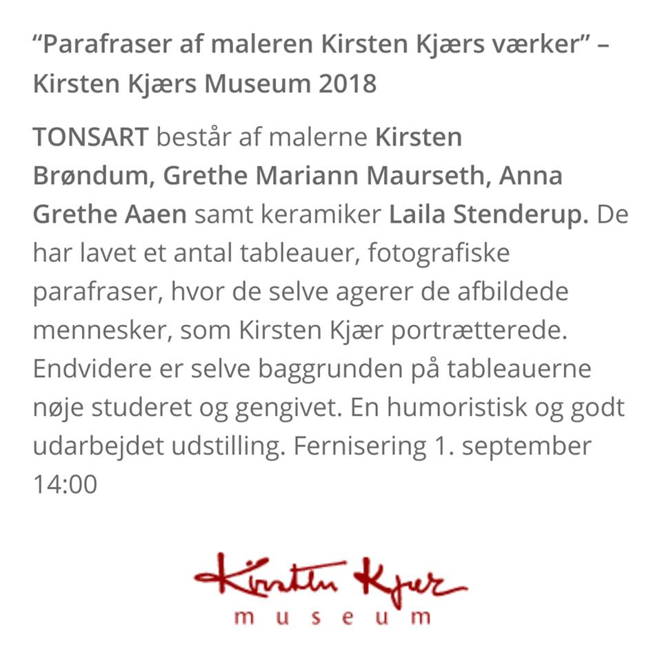 Parafraser af maleren Kirsten Kjærs værker" - Kirsten Kjærs Museum 2018 TONSART består af malerne Kirsten Brøndum, Grethe Mariann Maurseth, Anna Grethe Aaen samt keramiker Laila Stenderup. De har lavet et antal tableauer, fotografiske parafraser, hvor de selve agerer de afbildede mennesker, som Kirsten Kjær portrætterede. Endvidere er selve baggrunden på tableauerne nøje studeret og gengivet. En humoristisk og godt udarbejdet udstilling. Fernisering 1. september 14:00