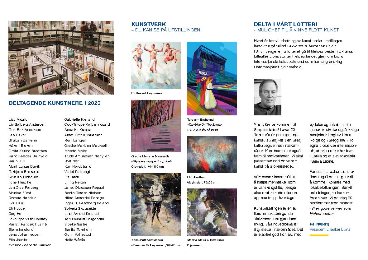 Alle er velkomne til Stoppestedet for å nyte kunst, ta en prat med oss for å lære mer om Lilleaker Lions og avslutte besøket med kake og kaffe i kafeteriaen.